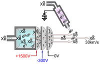 穴の沢山あいた (ー) 電極 に向かって突進する。穴が沢山あるのでほとんどの イオン は 通 過します。
